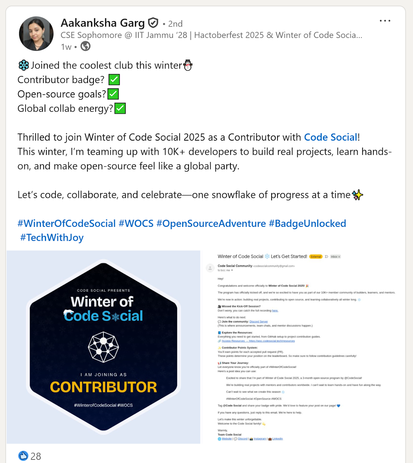 Code Social is a community of more than 10,000 aspiring and early-career computer developers who learn, build, and problem-solve together. Founded by Arushi Malhotra, what began as a small WhatsApp group has expanded across platforms like LinkedIn and Discord to offer peer support and a collaborative entry point into coding, particularly for women navigating the field.